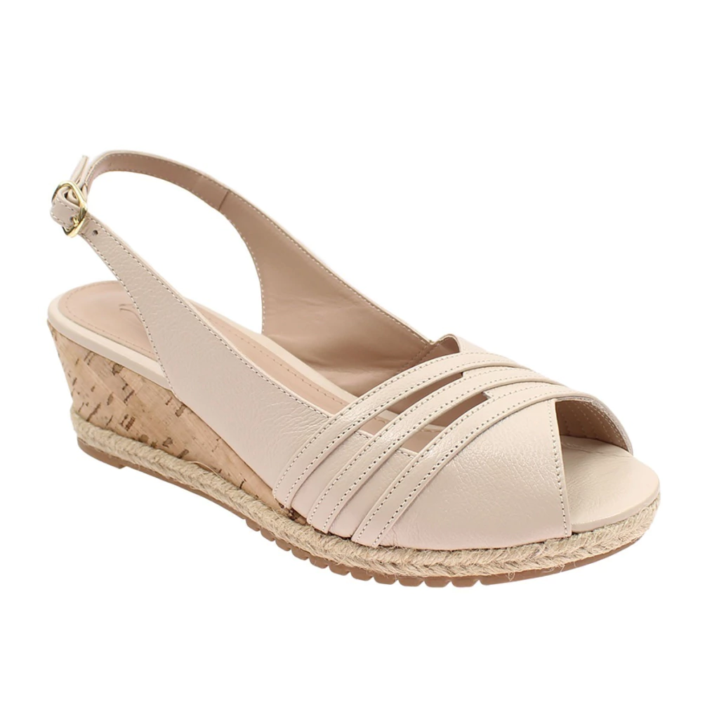 Esta sandália alia o clássico salto anabela com materiais de alta qualidade, proporcionando um caminhar estável e elegante. O solado em cortiça e corda confere leveza e um visual natural, perfeito para quem gosta de peças que unem moda e funcionalidade.